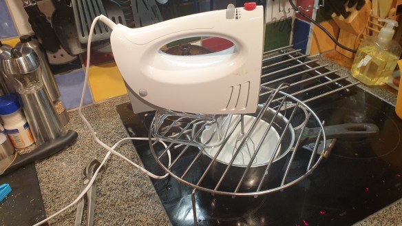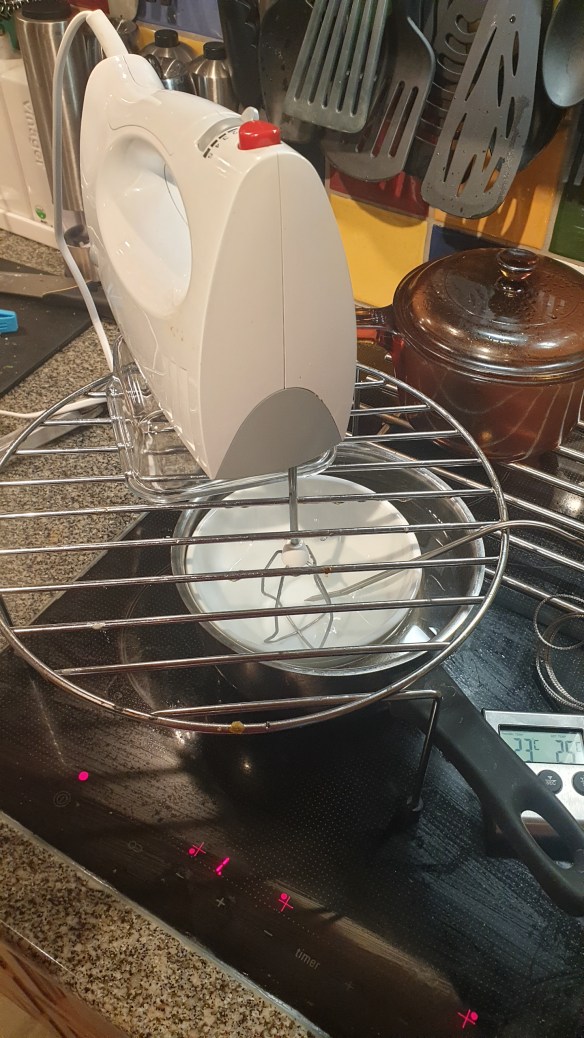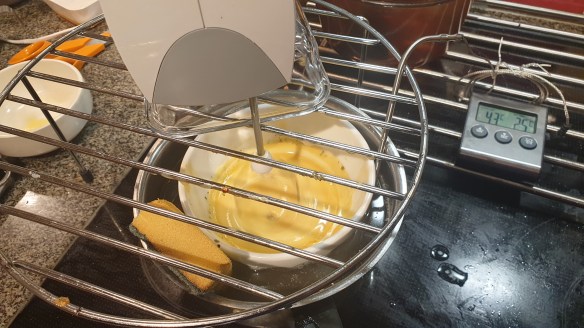 Rigga upp vispen till lagom höjd för att nå botten på vattenbads-skålen. Tag fram alla ingredienser i god tid så att de håller rums-temperatur.