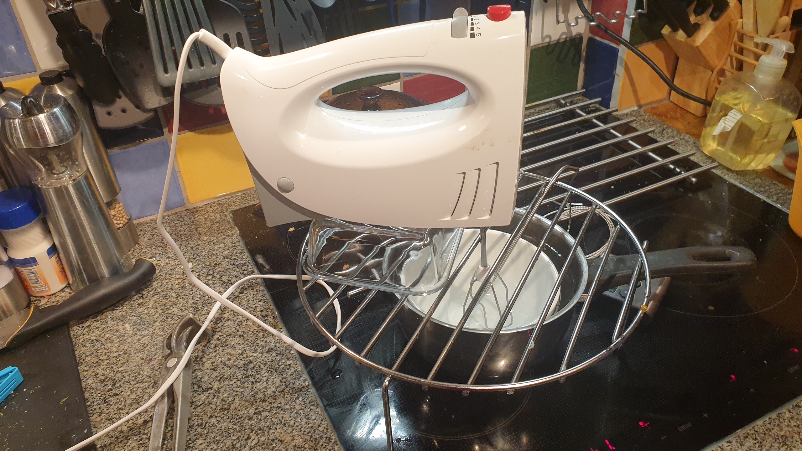 Rigga upp vispen till lagom höjd för att nå botten på vattenbads-skålen. Tag fram alla ingredienser i god tid så att de håller rums-temperatur.